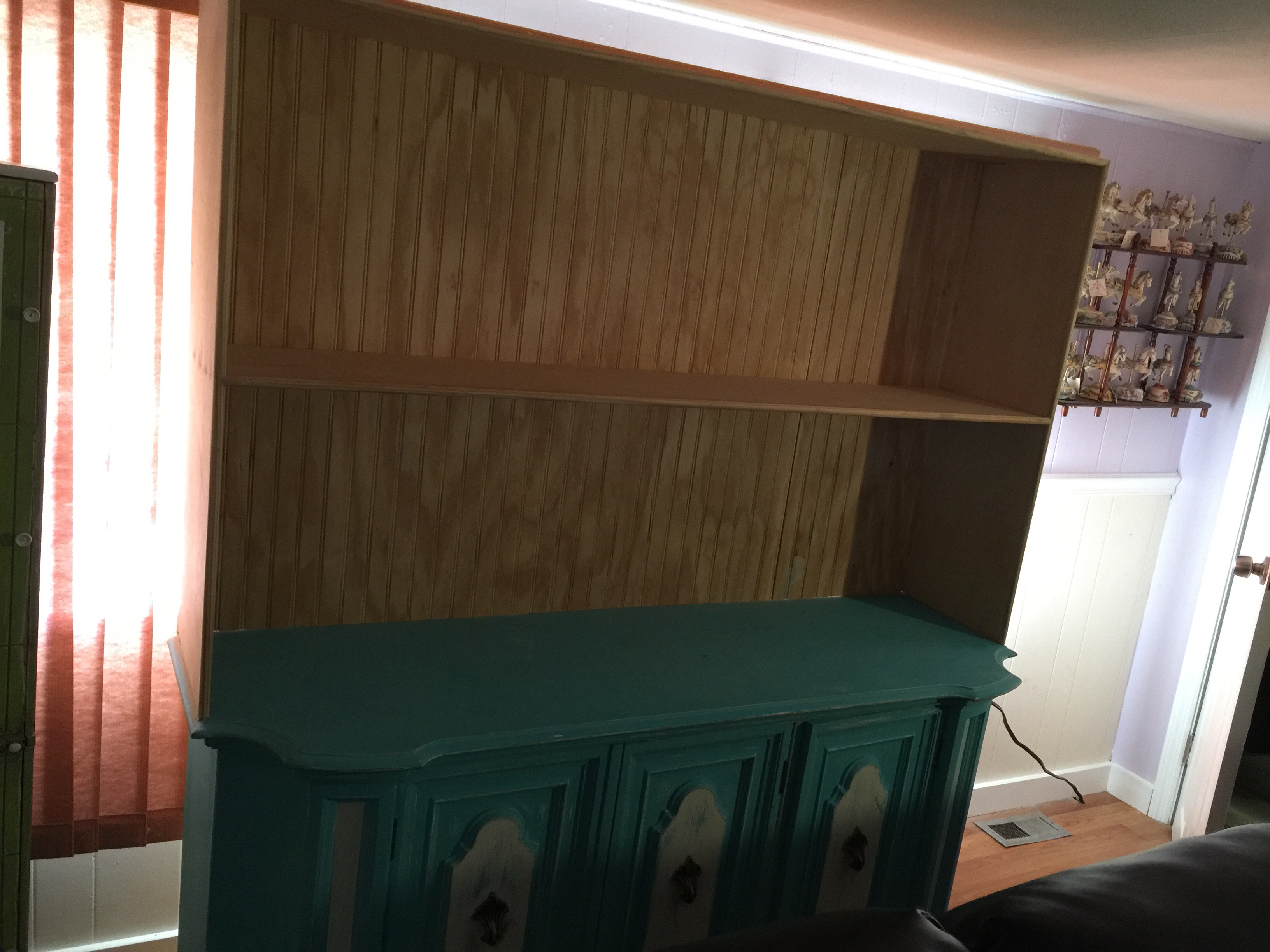 this is cabinet after we added bead board back with middle shelf and sides added.after the build we primed the bead board back to be painted a solid pink color as a nice back drop for the dolls. The sides were primed and then entire piece was sanded to show areas of old finish to come thru.. We then painted the piece A nice lavender / purple color.. Which in turn we carefully blend sanded areas and in certain areas sanded right thru to bottom finish.. You can do this to your own liking.