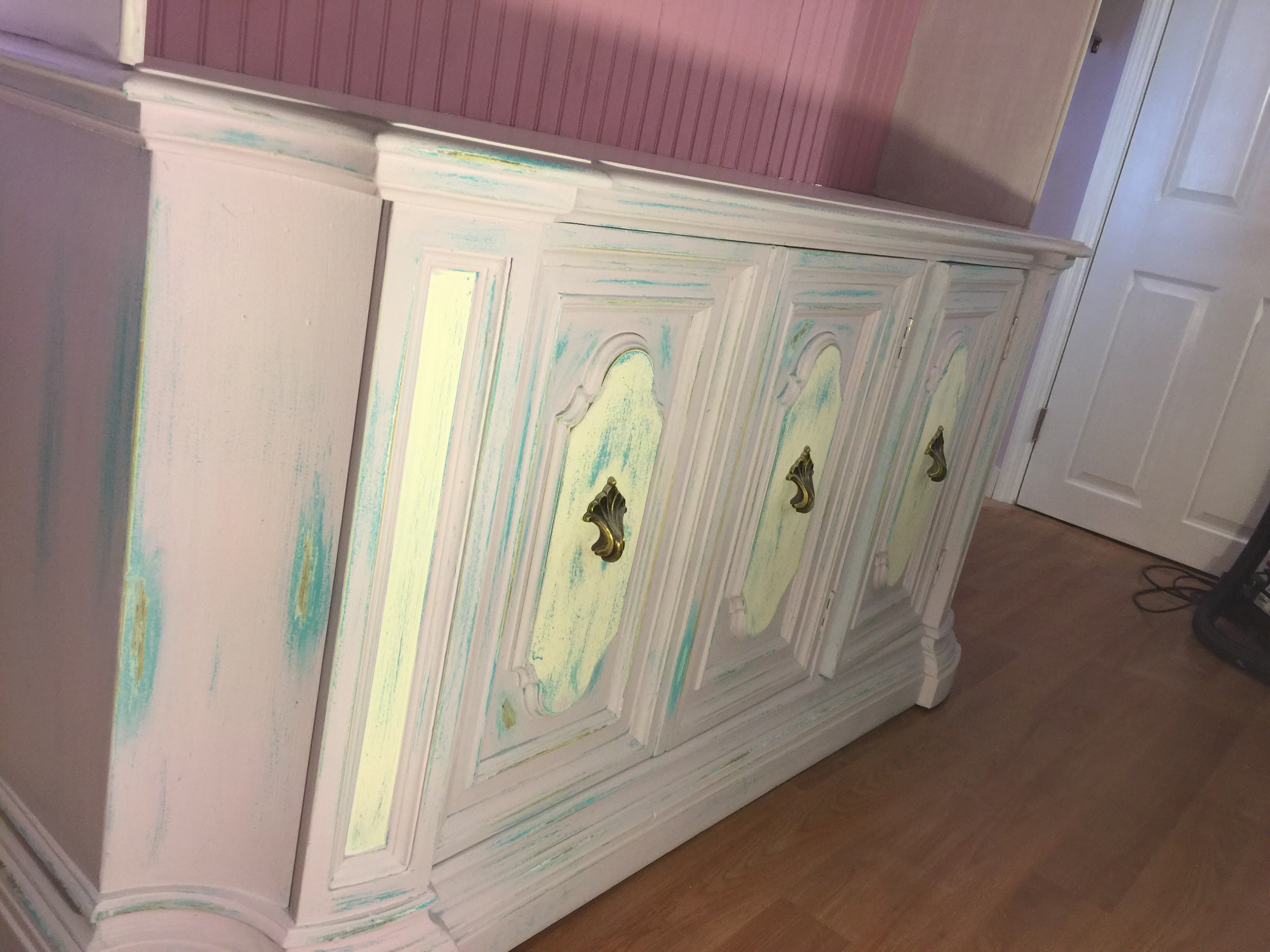 on the front doors we painted white over the blue and lavender sanded finish. Then proceeded to scuff sand the white on doors.. We left original hardware period to the original base..all paint used on this piece was acrylic base paints .. You can also use chalk paints..