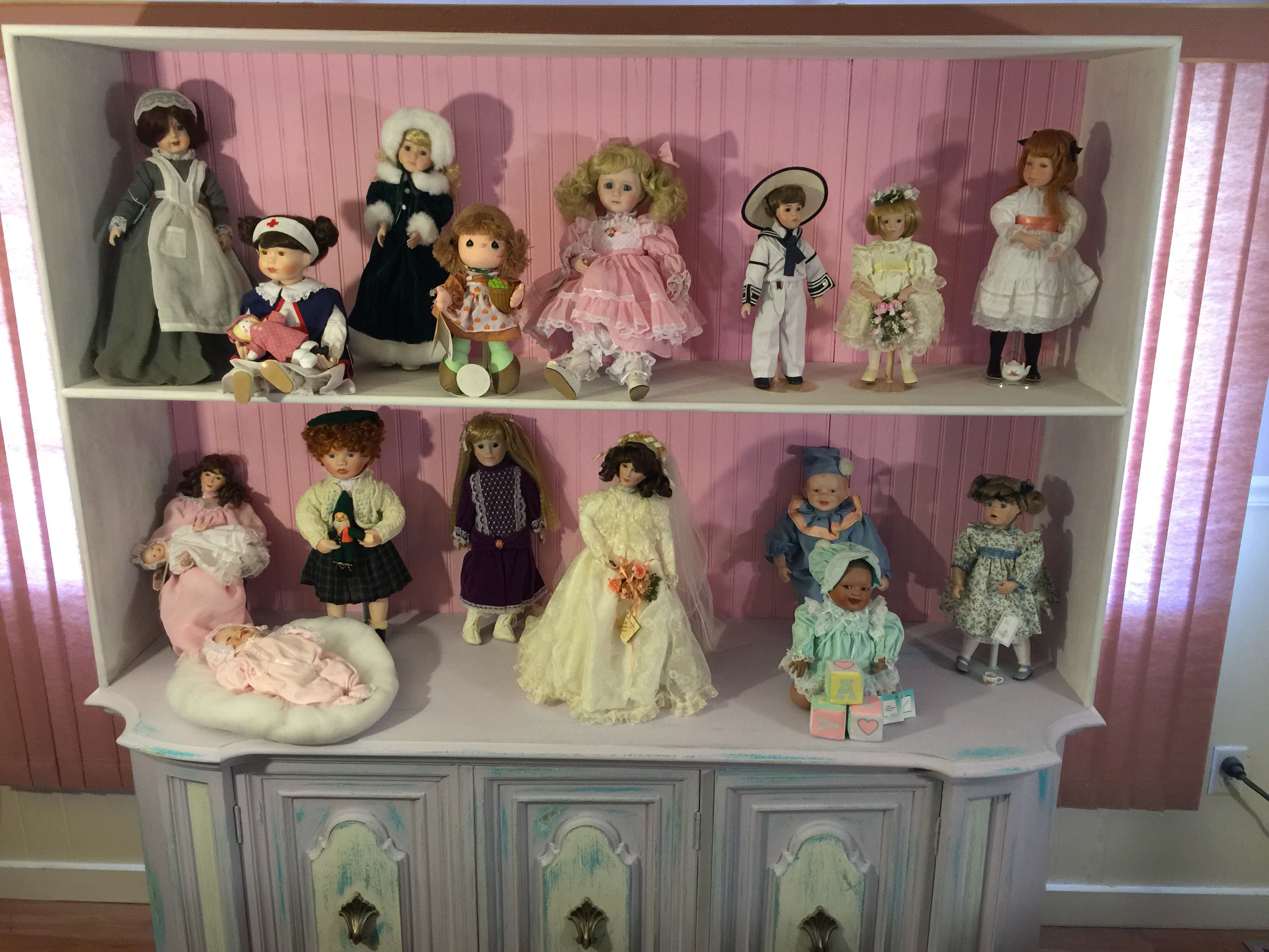 This was a project that started out as an old storage cabinet, which was made into doll cabinet by adding a top shelves and sides. Then the piece was given a shabby chic finish.