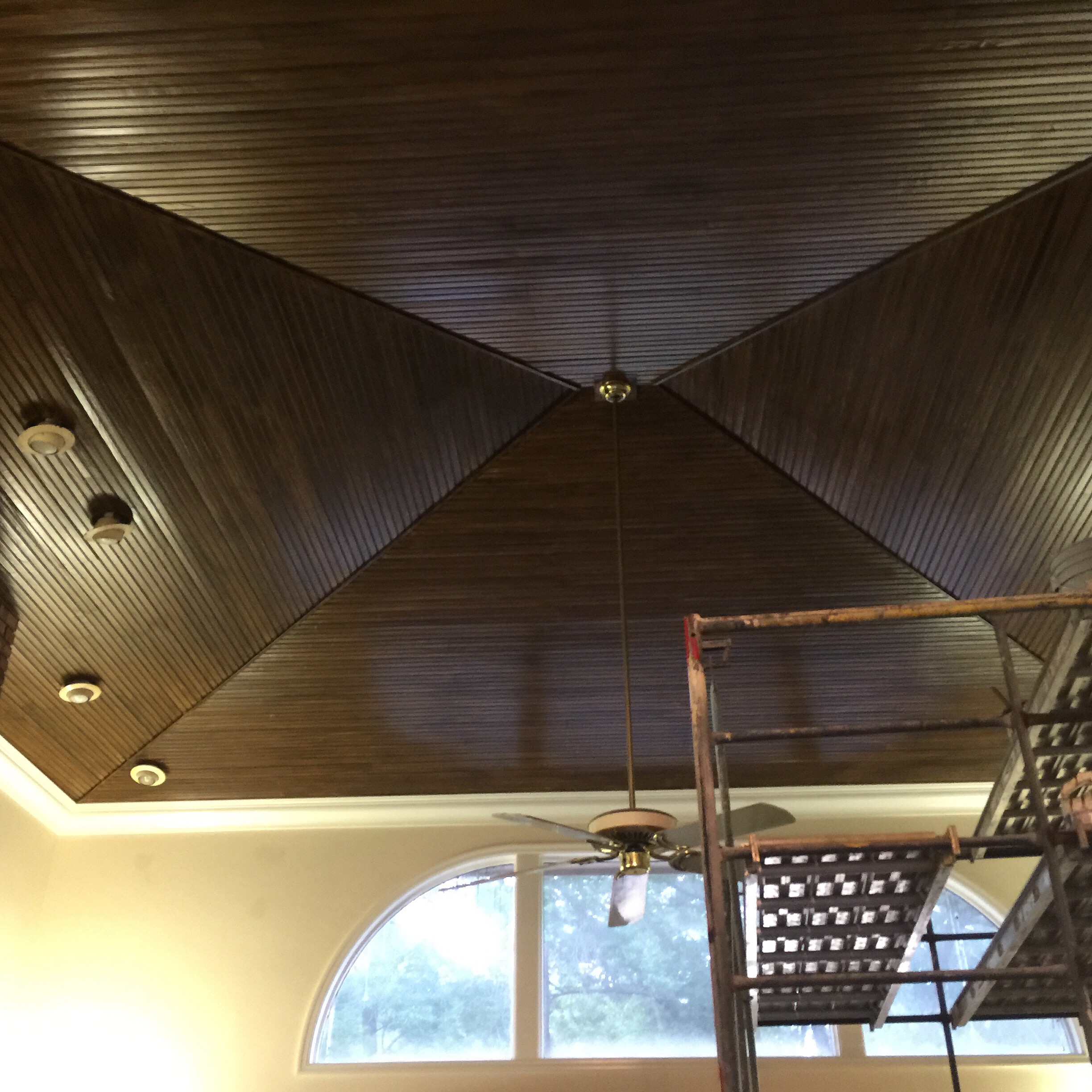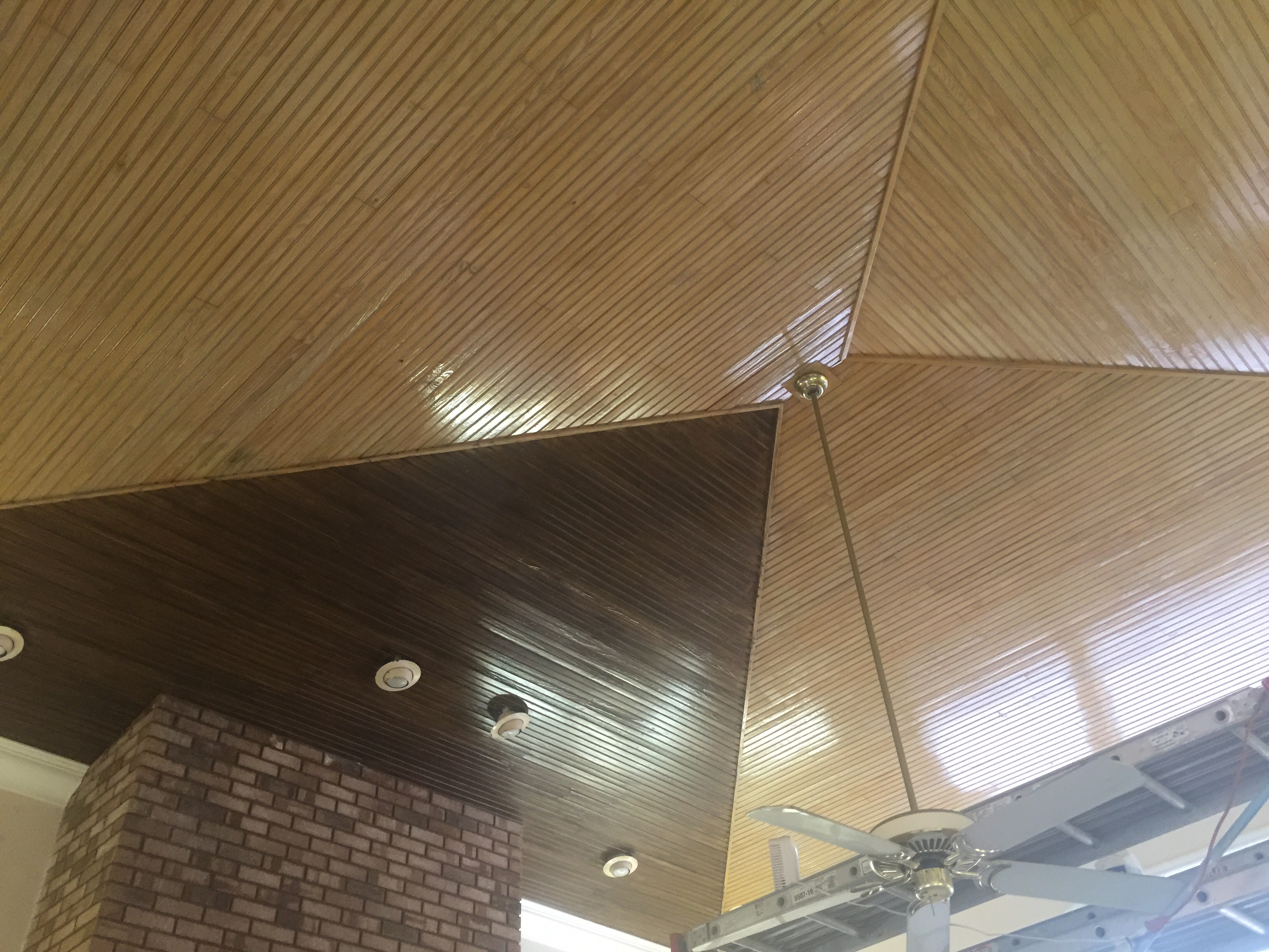 as you can see in the pic the lighter color on 3 sections is what we are redoing . The darker section is first coat of the new color. Since this ceiling is to high and awkward to reach, for our finish coat we are using an all in one finish.. This is a stain and poly in one can..these finishes are little tricky to work with as they do dry fast on such large area..so I recommend that you get some scrap word and practice how to get right brush strokes . Do use a high quality brush..what we did here was to get a non splotch more even finish is to do 2 coats… Just start at one end and only bring across about 3 boards at a time. You must keep moving with even strokes to avoid blotchy high spots.. Just work all way across then work your way back to other side.. After you complete the entire ceiling with the first coat.. Decide how you want do second coat.. Either a heavy coat or just slight brush strokes to fill in as needed.. Remember the idea is to make it look like a stained wood product ..