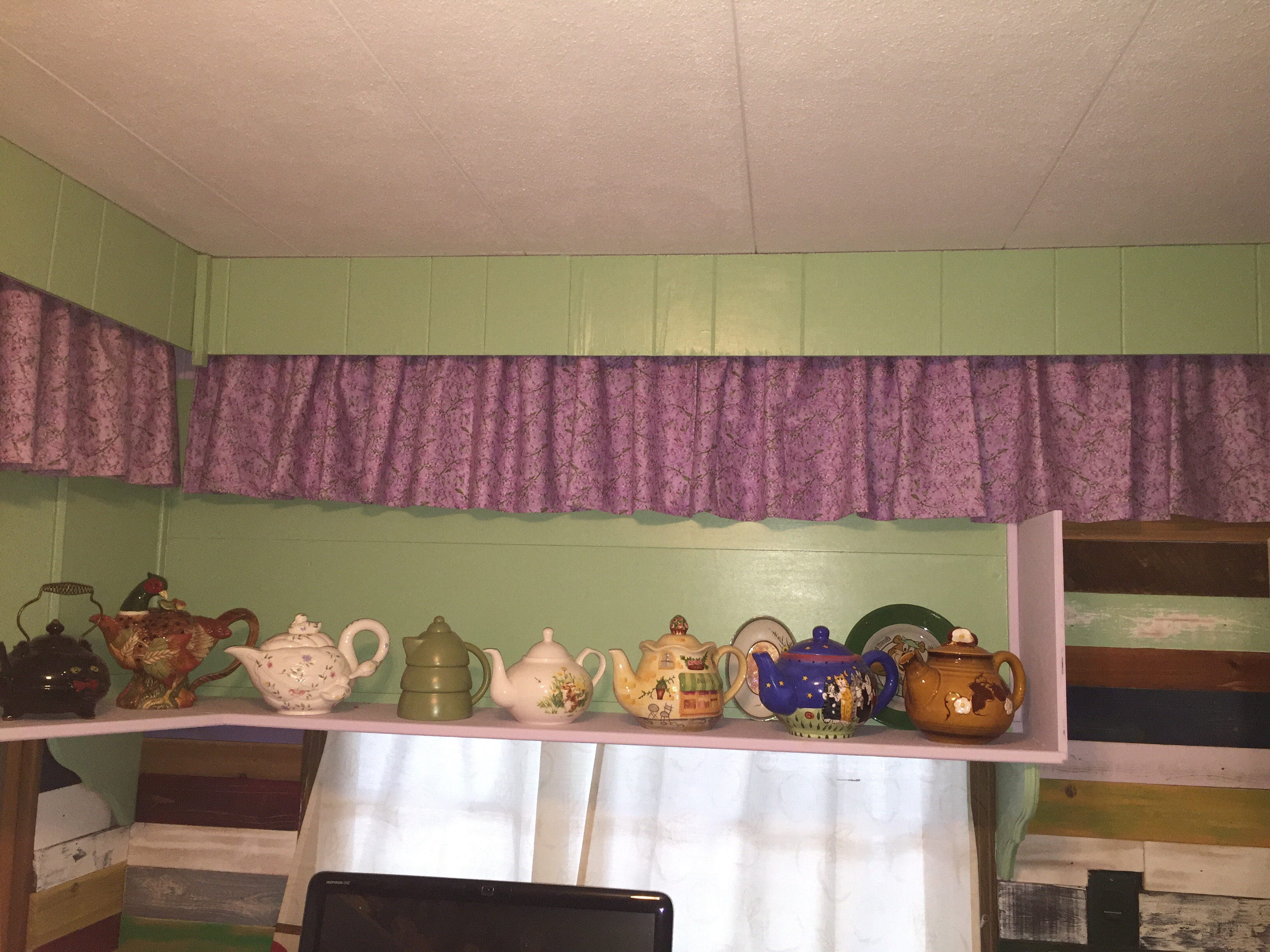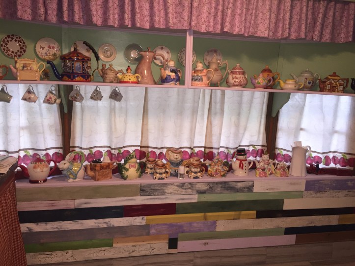 Welcome to my little kitchen project. During a remodel of kitchen ,which is a country design blended with a more modern design .My original idea was to find vintage kitchen items to use as decor, then one day at a home goods I saw some various animal teapots. As usual with my style when I see something I know that’s it ,that’s my design choice.( I have always have these ideas in my head and when I see the right item, decor piece or color , you just know it’s right). I started out with just double shelf . Then it became so much fun to search places for more unique and odd teapots . To add more teapots we added a shelf along back window and side window and lower ledge. During this process I decided during my searches to add teacups and saucers into the decor, which I really think defines the space. The search still continues for more teapots and cups/ saucers to finish the shelves and back walls. How we decided to purchase the items to make it fun. Was not to do online buying for most part. Decided to do flea markets, auctions, antique stores, department stores . Yard sales,thrift stores. This makes search so much more fun. Over time search to find more and more unique items is little difficult now, but that’s the challenge. These teapots range from just several dollars ,to most expensive one is about several hundred. I actually look for bargains since I just want them as decor, and not resale values.. As you can also see in pics the the slotted walls with aged, multi colored antiqued finish I did piece by piece , all by hand. Those walls were a project just them selves.. The walls and teapots really do compliment my kitchen design that I wanted to achieve.Please if you have question about teapot or the walls I did. Feel free ask
